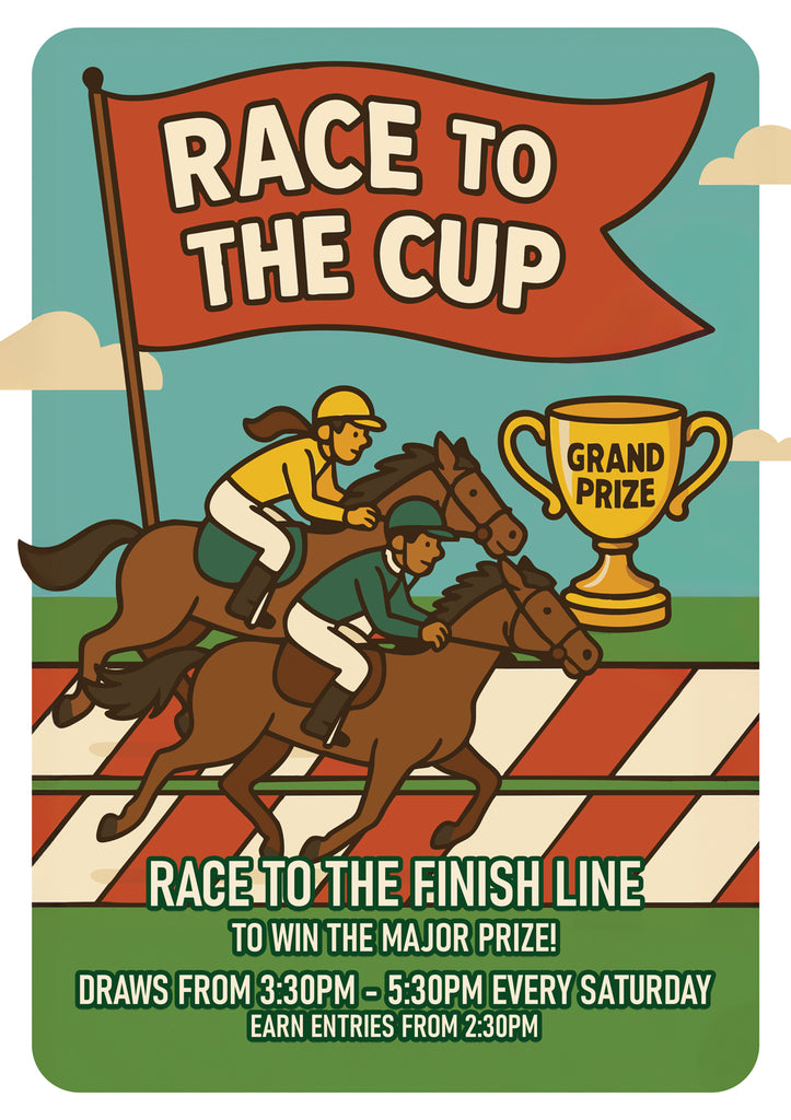 Celebrate Spring Racing with our Race to the Cup promotion! Race to the finish line by flipping a coin and earn prizes along the way! Those who reach the finish line will win the major prize: 2x VIP tickets to our Melbourne Cup Day function! Come down every Saturday and earn entries from 2:30pm with draws from 3:30pm - 5:30pm!